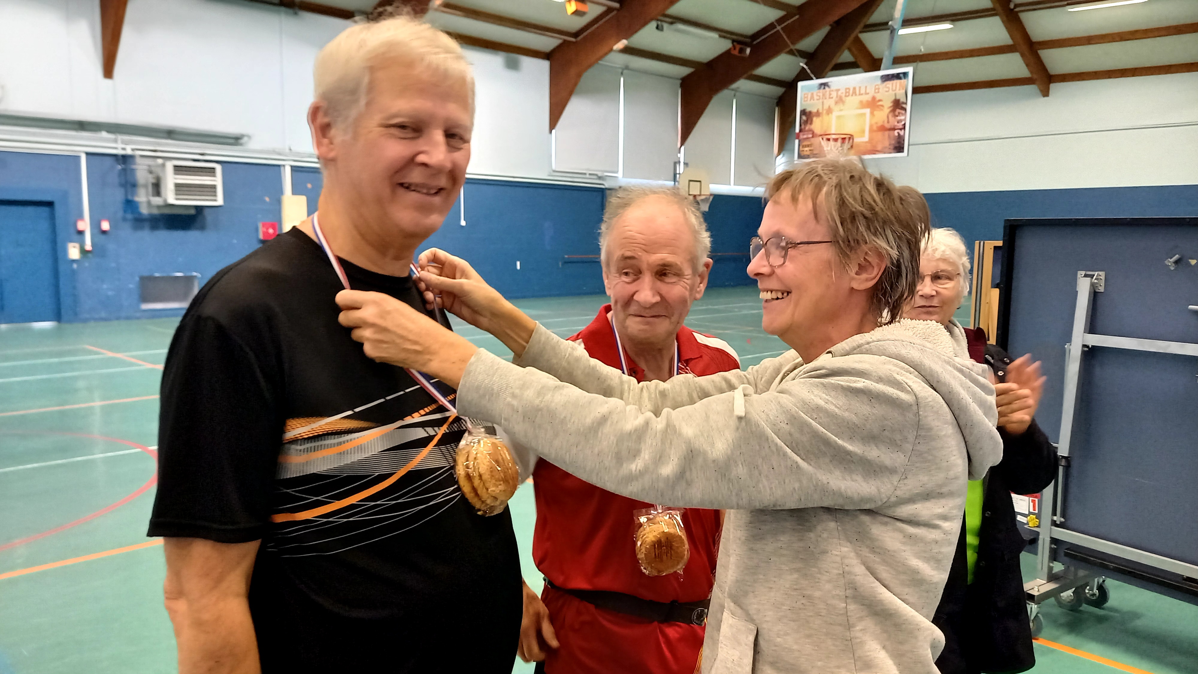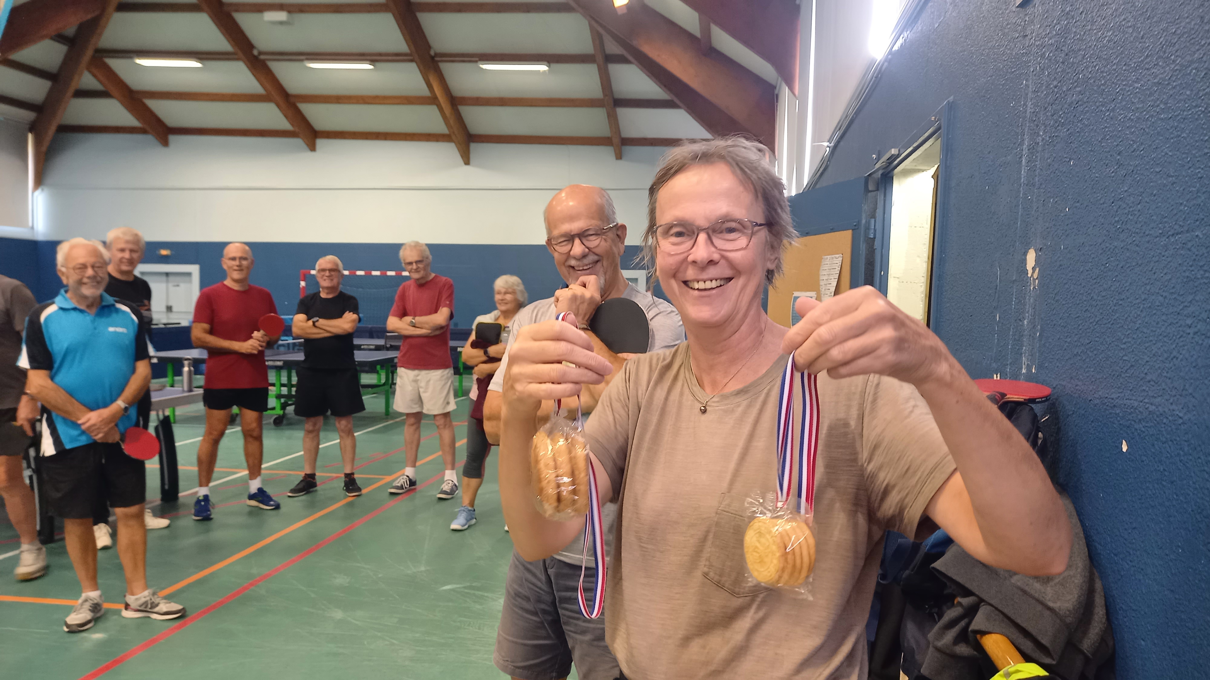 A l’issu d’un match serré (9/11 – 7/11 – 11/5 – 11/5 -11/9), Michel Leménicier et Eric Gautier (équipe C) arrivent en première position et reçoivent les Galettes charentaises devant Elisabeth Bossu et Bruno Chapira (équipe L) qui obtiennent les Galettes St-Michel. A la troisième place Janine Tager-Kagan et Patrick Rippe (équipe F) n’ont rien à manger !